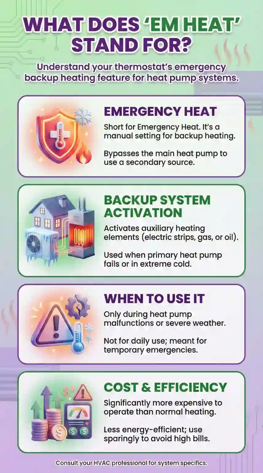 EM heat stands for Emergency Heat—a backup heating mode that bypasses your heat pump and runs only your secondary heat source. That red light on your thermostat isn't a malfunction warning. It's telling you the system switched to a less efficient (and more expensive) heating method.